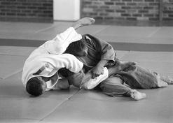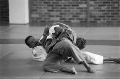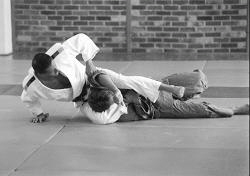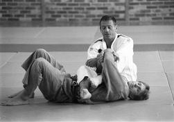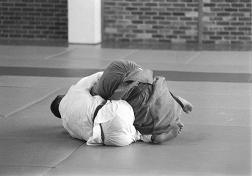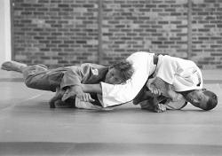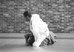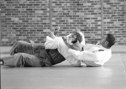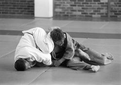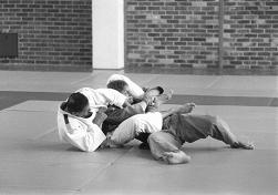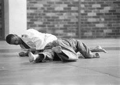 Abb. 4 bis 6 Die Verteidigung Ukes läßt es zu, dass Ralf zur Seite des eingesetzten Knies kippen, den eigenen Spann in die Kniekehle des anderen Beines legen und damit das Dreieck fixieren kann. Durch Streckung des Armes und gleichzeitigen verstärkten Beindruck entsteht sowohl ein Hebel als auch ein Würger.