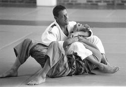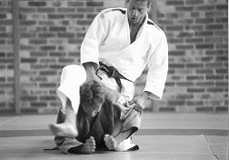 Abb. 22 und 23 Er greift beide Beine und kippt Uke als Einheit über sich.