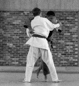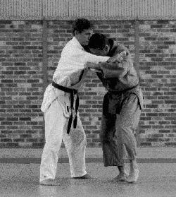 Beim Kumi-kata greift Ralfs linke Hand Ukes Ärmel und zieht nach vorne, während die rechte Hand über Ukes linker Schulter auf dessen Rücken greift. Die linke Schulter Ukes ist gut kontrolliert. Abb.2 Ralf zwingt seinen Partner in eine Kreisbewegung, gegen die dieser sich aber sperrt
