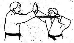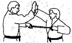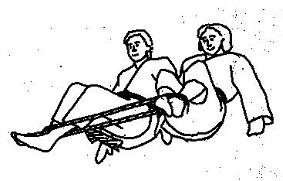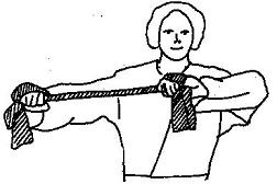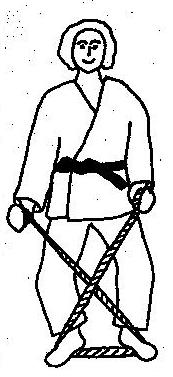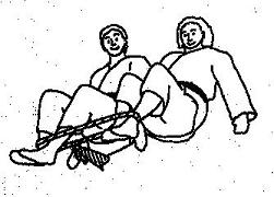 Die Partner liegen sich gegenüber in Armlängen Abstand voneinander entfernt. Beide halten das zur Schlinge geknotete mit beiden Händen im breiten Griff wie