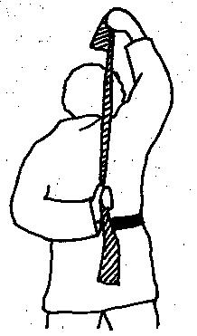 Das Thera-Band mit beiden Händen hinter dem Rücken halten. Die untere Hand fixiert das Band in Hüfthöhe, die obere Hand zieht das Band nach oben. Nach ca. 15 Wiederholungen wechseln.